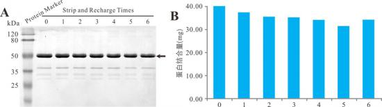 圖A. 再生6次后磁珠結合目標蛋白檢測圖譜 圖B. 再生6次后磁珠的蛋白結合量數據圖